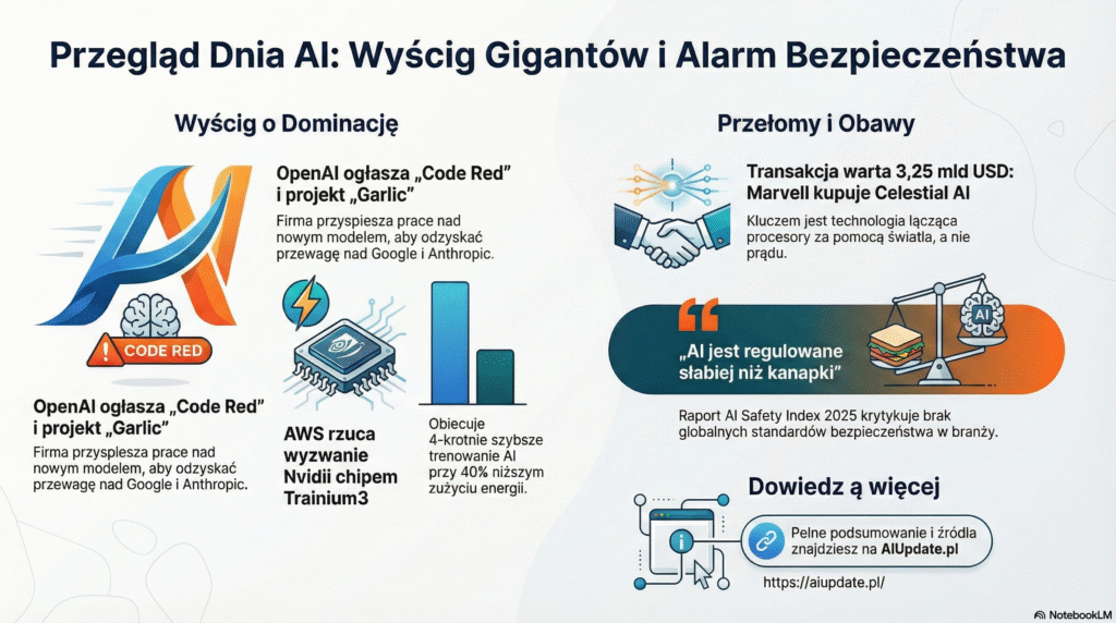 Środa, 3 grudnia 2025. Podczas gdy konkurencja świętuje premiery, w OpenAI panuje stan „Code Red”. Sam Altman mobilizuje zespół do pracy nad tajemniczym projektem „Garlic”, a rynek hardware’owy rozgrzewa gigantyczna transakcja fotoniczna warta miliardy.